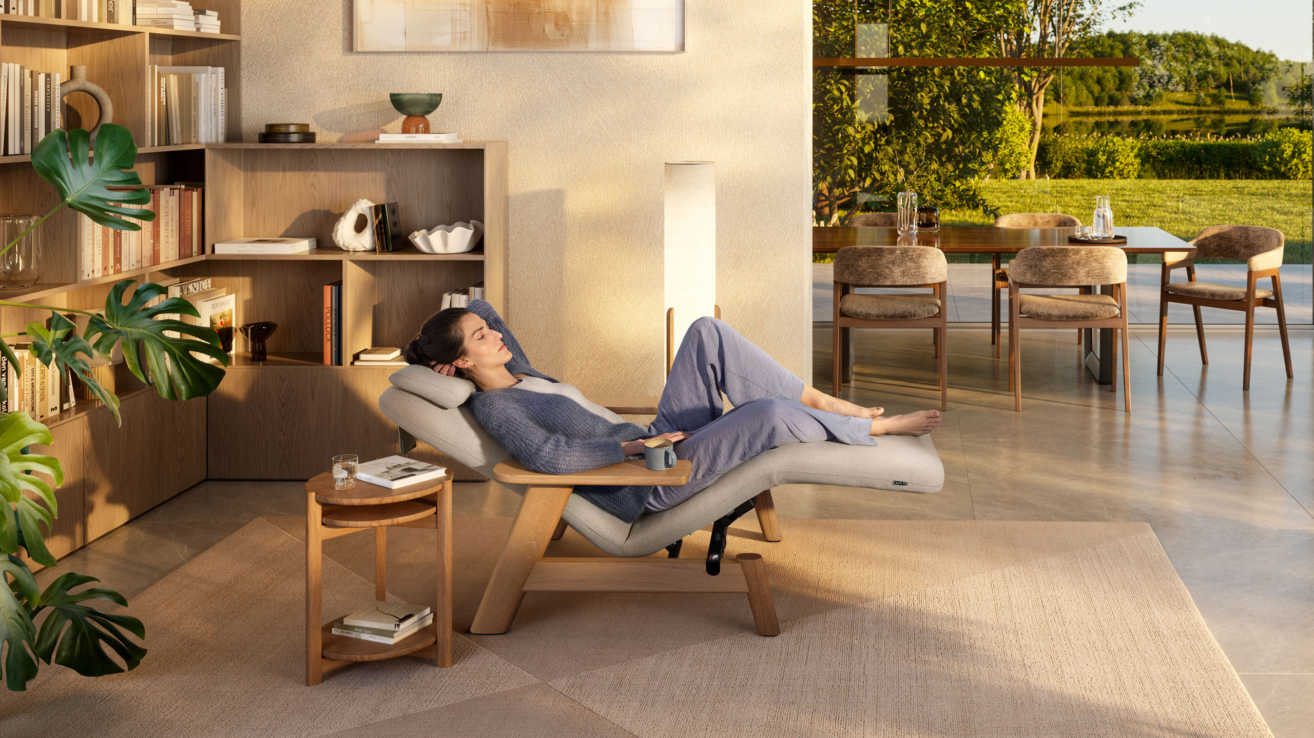 Die Wellnessliege SOMRA ist in zwei edlen Varianten erhältlich – wahlweise mit einem Gestell aus geölter Eiche oder Nussbaum. Designer Sebastian Herkner bringt in der Gestaltung Holz und Stoff mit händeschmeichelnder Haptik in weiche, fließende Formen. So entsteht eine zen-artige Atmosphäre, die Behaglichkeit und Entschleunigung ausstrahlt. Das ergonomische Design wird durch eine komfortable Polsterung und ein weiches Nackenkissen ergänzt. Zwei Armstützen bieten angenehm breite Ablageflächen – ideal zum entspannten Auflegen der Arme oder für kleinere Gegenstände. Die großzügige Liegefläche von 1900 x 518 mm unterstreicht den Liegekomfort zusätzlich.
